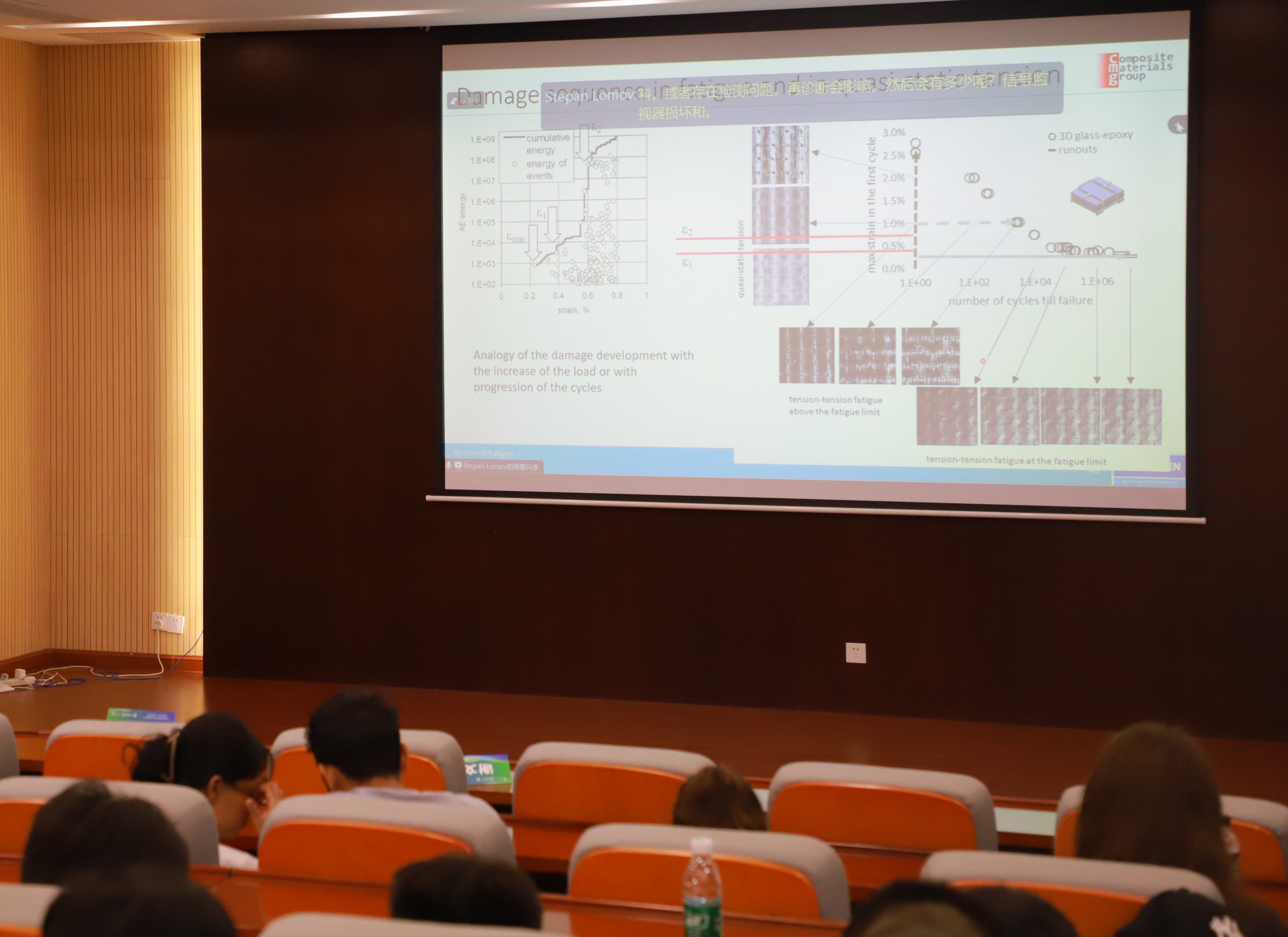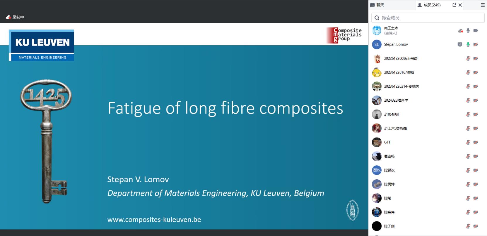 Stepan V. Lomov 教授以《Fatigue of composite materials》为题,针对具有高强轻质特性的连续纤维增强树脂基复合材料的疲劳力学行为及其研究方法展开了细致深入的介绍。报告由浅入深,从疲劳的定义以及如何开展材料疲劳及结构疲劳开始,从宏观上让学员们初步了解如何开展复合材料及其结构的疲劳特性研究;随后,从宏观迈入微观,针对复合材料特殊的材料构成,分别针对其组分材料的疲劳特性进行了详细介绍;除了组分材料的影响,复合材料复杂的微结构也会对其疲劳行为产生影响。因此在进行复合材料抗疲劳设计时,要综合考虑组分材料性能、微观结构、载荷形式等多种因素。Lomov教授的报告从材料到结构,从微观到宏观,让学员们看到了结构工程设计中不同尺度存在的科学问题,拓宽了学员们的视野。