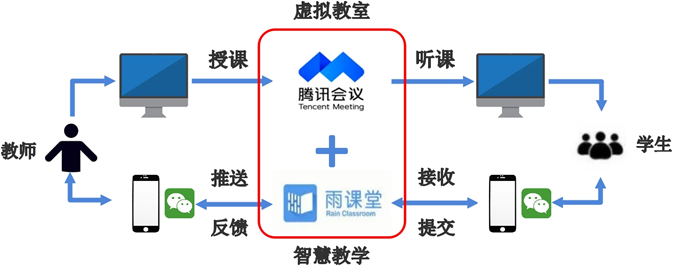 “雨课堂”是一种基于微信和PPT的新型智慧教学工具,是教育部在线教育研究中心的最新研究成果,轻量易用、操作便捷。“腾讯会议”是一种远程沟通的线上会议软件,是腾讯打造的云视频会议生态,高清流畅、安全可靠。“腾讯会议+雨课堂”在线教学模式充分融合了“腾讯会议”和“雨课堂”的优势,更好地满足了在线教学的需求。