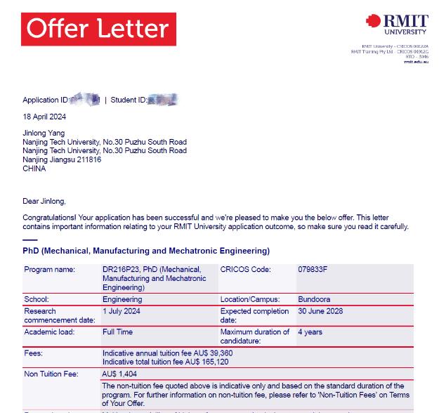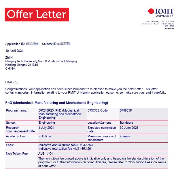 近日,太阳集团tyc33455官网冯闯教授指导的两名硕士生经推荐获得了澳大利亚利亚知名高校皇家墨尔本理工大学博士生全额奖学金。