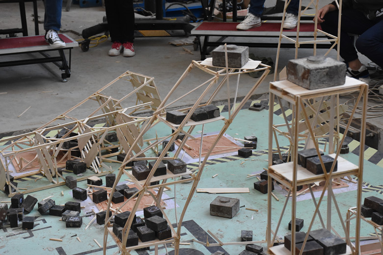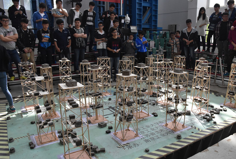 除了精彩的趣味赛和体验活动,“土木科技周”还有激烈“专业赛”。土木工程专业公司大三年级130余组参赛队伍精心制作的多层房屋结构模型,集中于实验室的地震模拟振动台等待加载。加载过程紧张激烈,同学们纷纷围在地震台周围翘首以盼。大部分参赛的加载组都通过了振动台的一到三级加载,40余组制作的模型抗震效果优异,通过了四级加载。比赛最终由专业老师从方案说明书、结构选型、制作工艺、加载表现等各项评分标准综合评审出最优抗震结构模型。
