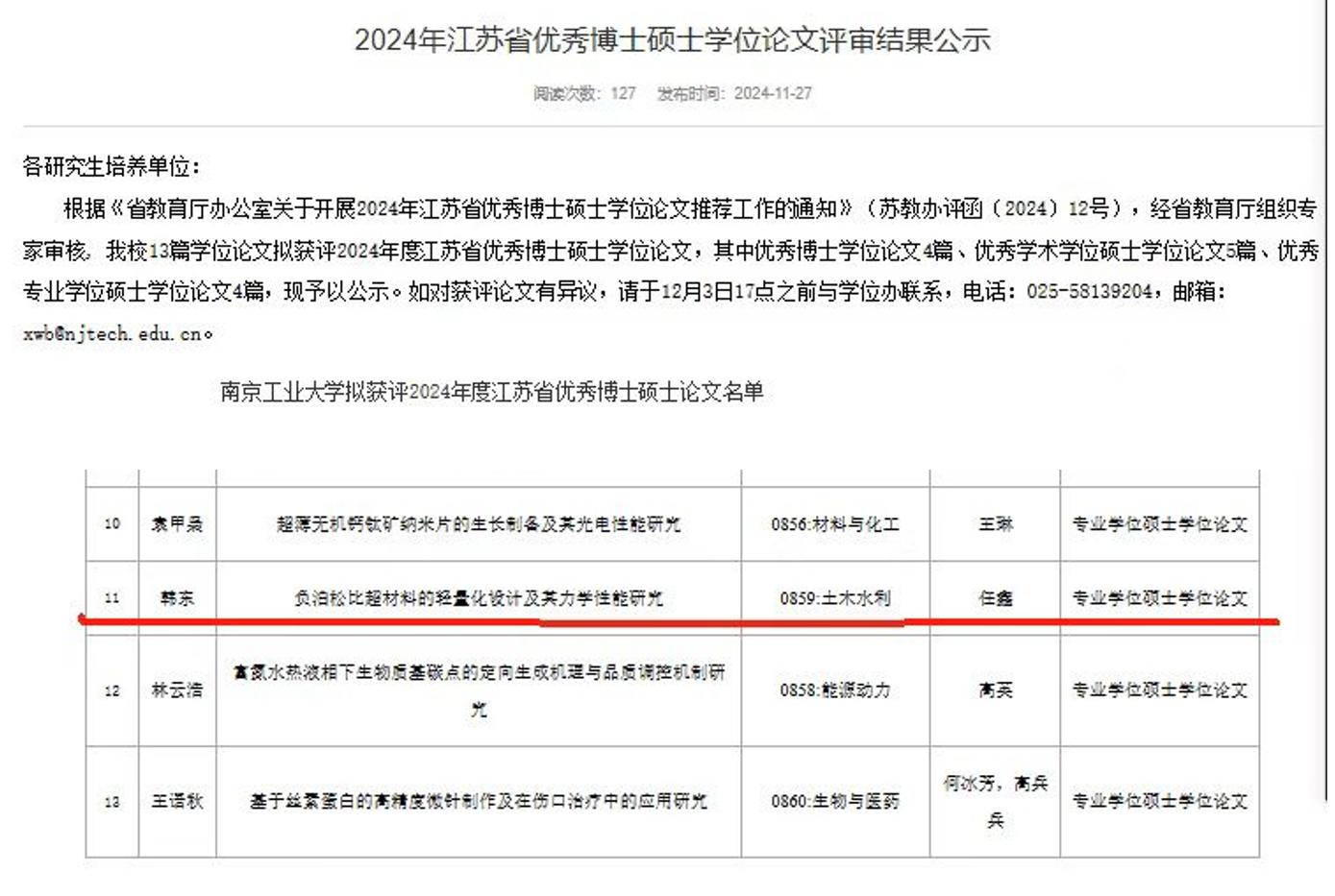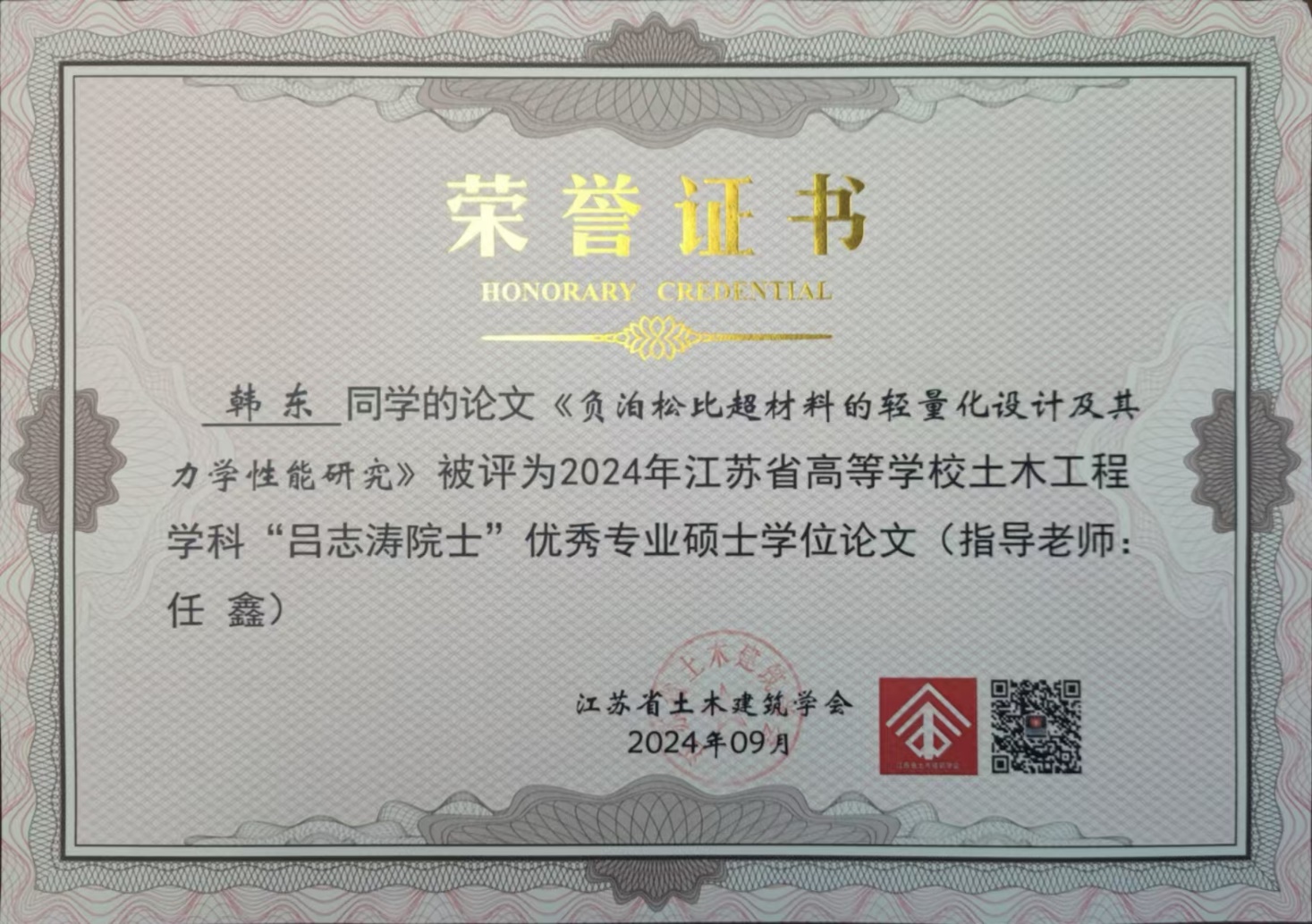 硕士阶段的学习历程,使韩东同学收获了宝贵的人生哲理:任何事业的征途都不可能一帆风顺,科研之路尤甚。面对挫折,我们或许会感到沮丧与气馁,但正是这些挑战,一旦克服,将赋予我们前所未有的成就感与自信心。正是基于这样的感悟,韩东同学在硕士毕业后,毅然决然地选择了继续深造,通过不懈努力,成功迈入了同济大学的大门,开启了攻读博士学位的新篇章,与多位985和双一流高校的硕士毕业生角逐,最终胜出,以专业第一的成绩获得年级唯一的博士新生国家奖学金。仿佛是命运的巧妙安排,韩东同学与超材料之间的不解之缘得以延续。步入新的科研阶段,韩东同学已做好充分准备,迎接一切可能的挑战。他深知我国超材料与结构领域的发展现状与挑战,立志要针对这些瓶颈问题,不断探索与创新,为推动超材料在工程领域乃至日常生活中的广泛应用与发展,贡献自己的智慧与力量。在未来的科研道路上,韩东将以更加坚定的步伐,勇往直前,脚踏实地,勇敢面对学术生涯的一切挑战,立志做一名杰出的南工大员工,为公司和公司增光添彩。