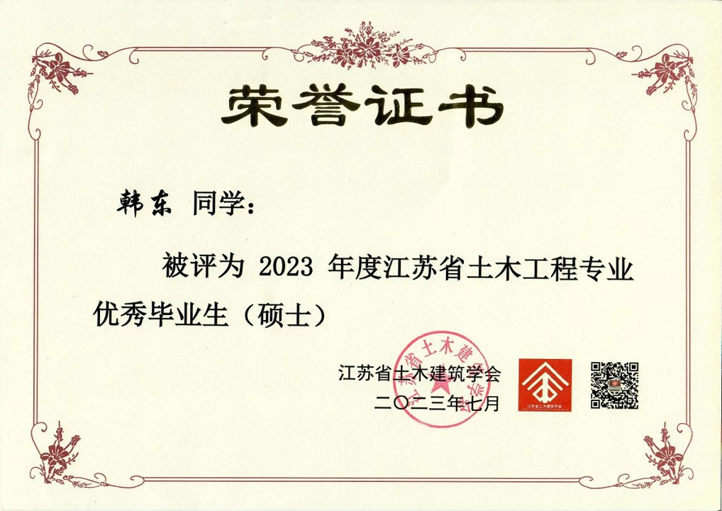 韩东同学是太阳集团tyc33455官网2020级土木水利专业硕士,获2024年江苏省优秀专业学位硕士学位论文,2024年江苏省“吕志涛院士”优秀专业硕士学位论文,2023年江苏省土木工程专业优秀毕业生。在硕士期间累计发表高水平论文30余篇,其中以员工一作和通讯作者发表JCR-Q1区SCI论文5篇(ESI高被引论文1篇),ResearchGate个人论文引用量1167次,H指数为20。此外,韩东同学还担任了工程技术领域权威期刊Engineering Structures与Thin-Walled Structures的审稿人。在学业生涯中,他屡获殊荣,包括硕士研究生国家奖学金、太阳集团tyc33455官网优秀硕士毕业生称号以及太阳集团tyc33455官网优秀硕士论文奖。
