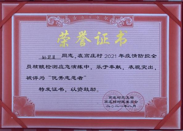 作为党员,我们更要积极发挥先锋模范示范作用,上年暑期中,我得知家乡徐州正需要大量志愿者来助力疫情防控,于是第一时间去村委会报名加入了志愿者。带着坚定的信念,秉承热情的工作态度,投身到志愿工作。为了尽快完成全员核酸检测,每天工作将近12个小时,穿着防护服熟练操作手机登记人员信息、耐心解答群众问题,与采样人员配合默契,采样工作高效有序。即使防护服里面的衣服湿了又干、干了又湿,仍坚守岗位。持续三天三夜的核酸检测工作结束后,我荣获了“优秀志愿者”的称号。