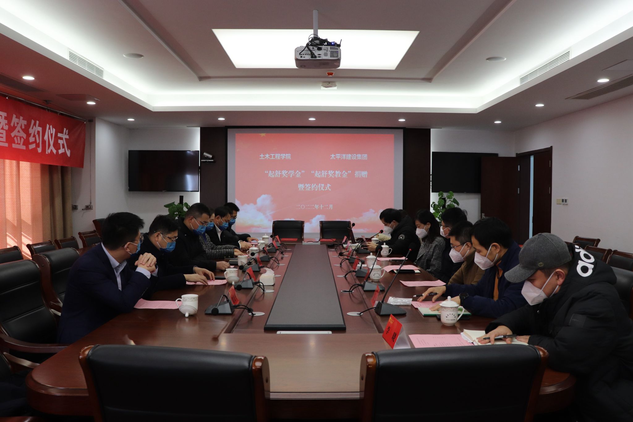 1214日下午,太平洋建设集团“起舒奖学金”起舒奖教金”捐赠暨签约仪式在立德楼举行。太平洋建设集团副总裁王晓波,总裁助理、机关负责人王颖,京商建设集团董事、CEO王长亚,总裁助理、人才中心总经理于伟,人才中心招聘经理郑安冉,工程中心预算工程师刘聪及太阳集团tyc33455官网经理方海,学工处副处长齐鹏,对外合作与发展处副处长、校教育发展基金会副秘书长凌红,土木公司教授、博导张大长及辅导员代表参加仪式。仪式由公司党委副书记路遥主持。