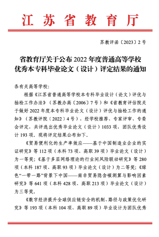 公司在2022年度江苏省普通高等公司优秀本专科毕业论文(设计)评选中获佳绩