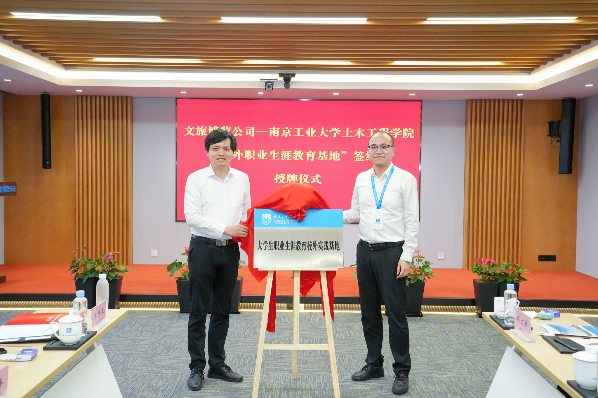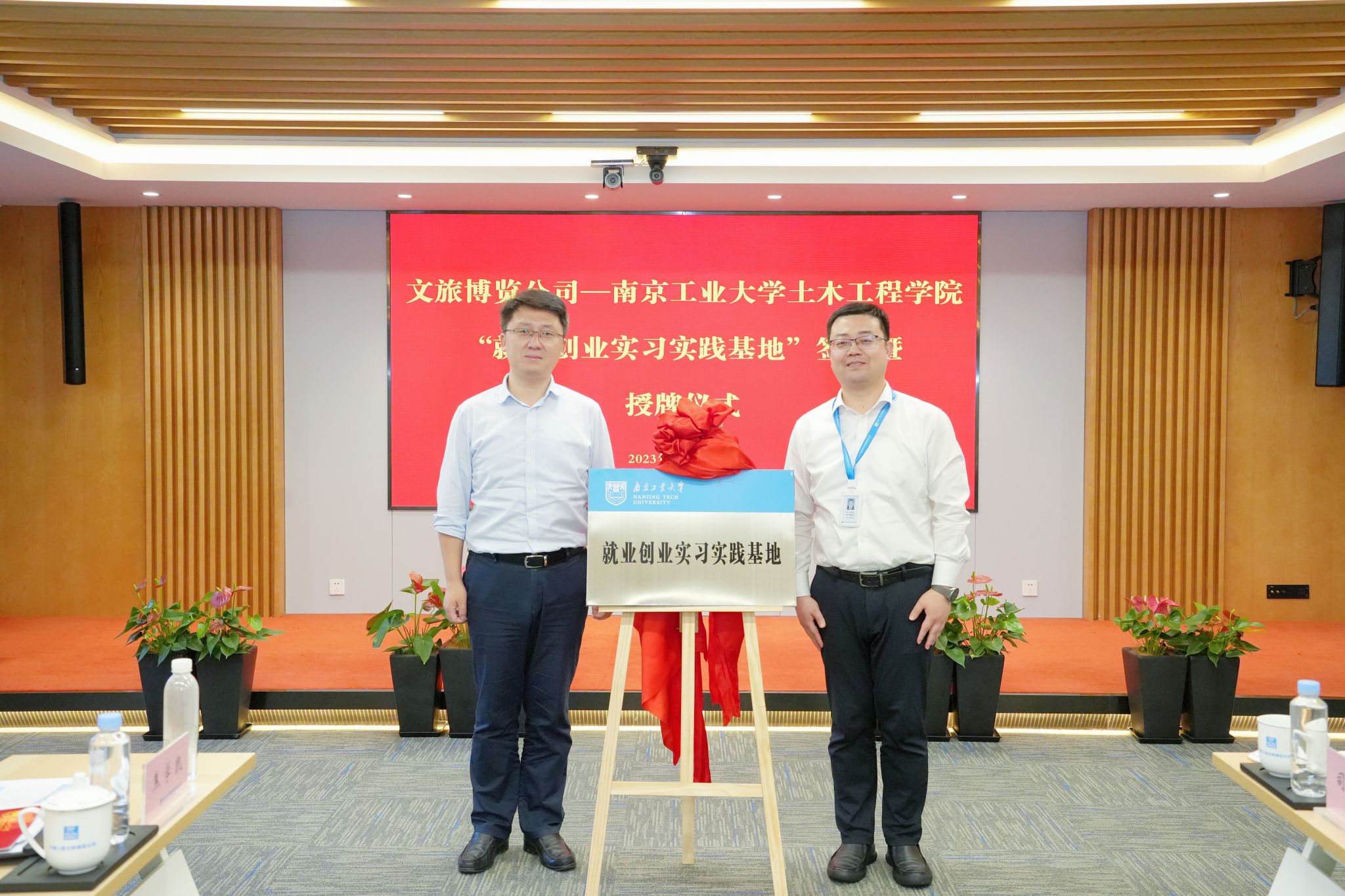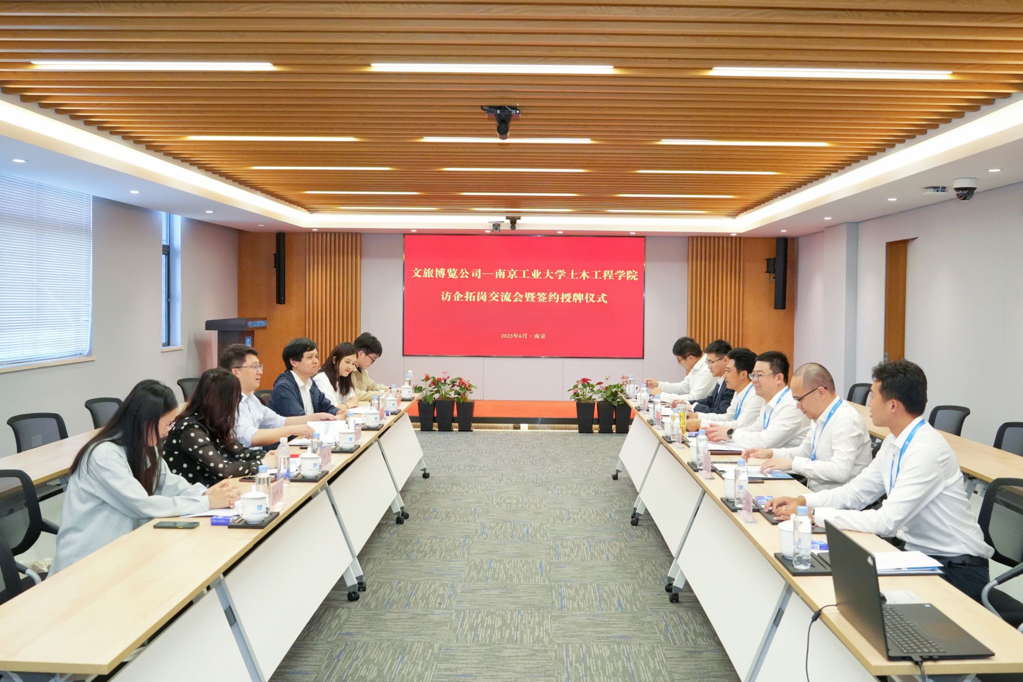 张忠阳书记在致辞中对方海经理一行表示热烈欢迎,并指出要贯彻落实党的二十大报告中“以文塑旅,以旅彰文”精神,希望双方在协同发挥党组织政治优势、协同健全联建工作机制、协同探索人才双向培养模式等三个方面加强合作,推动文旅事业再上新台阶。双方共同观看了企业宣传片,听取了孙玮经理对企业的全面介绍。方海经理对文旅公司长期以来对公司发展的关心支持表示感谢,充分肯定了文旅公司在项目开发、传承创新等方面取得的突出成绩。方经理从建筑业转型与双碳结构、绿色材料与低碳结构、智慧建造与智慧运维、城市韧性与防灾安全、公司基本情况等五个方面做了详细介绍,期待双方进一步加强科产教融合,在人才培养、科学研究、社会服务等方面全面合作,实现共赢。随后,双方就校企合作具体事宜进行深入交流并进行“就业创业实习实践基地”和“职业生涯教育校外实践基地”签约暨授牌仪式。