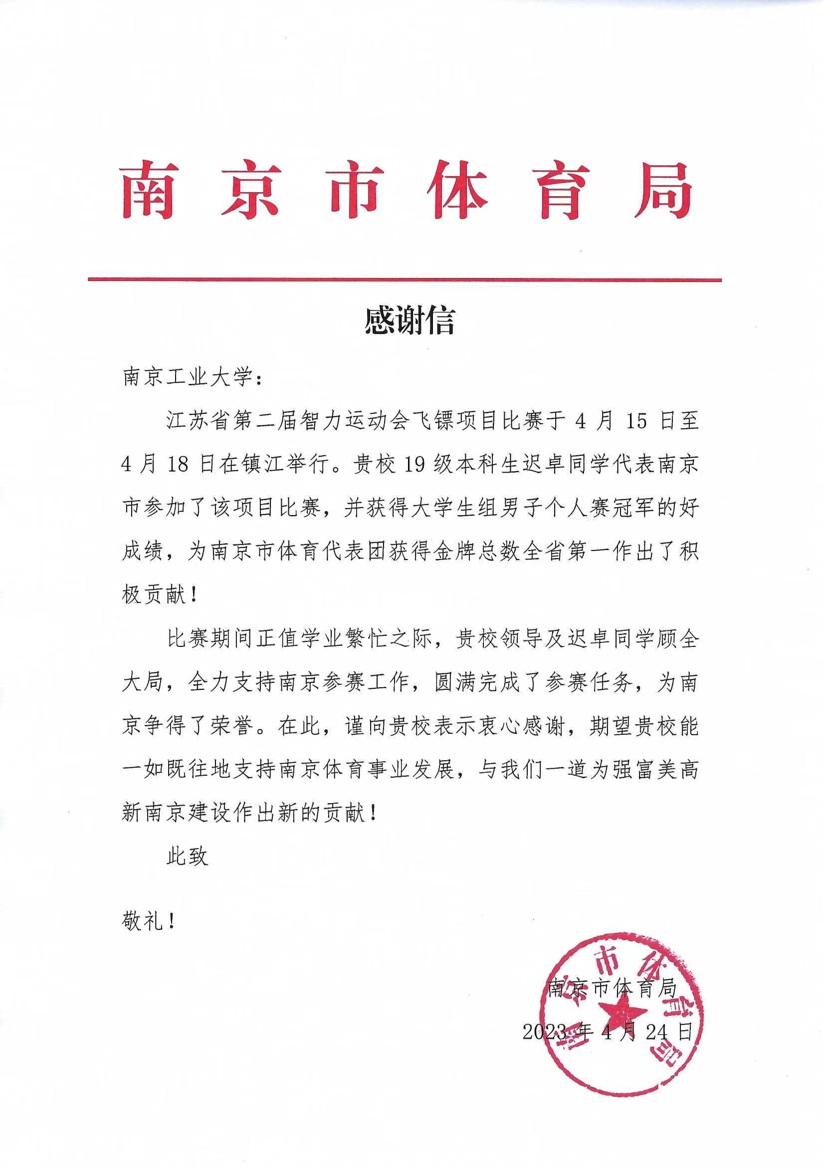 太阳集团tyc33455官网迟卓同学获省智力运动会佳绩受到南京市体育局感谢