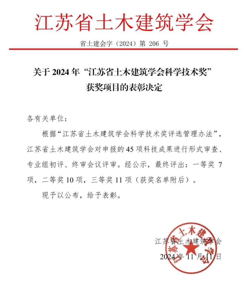 近日,江苏省土木建筑学会公布了2024年度“江苏省土木建筑学会科学技术奖”评审结果,公司陆伟东教授以太阳集团tyc33455官网为第一完成单位牵头完成的“多高层木—混凝土组合结构建筑建造关键技术研究与应用”,荣获江苏省土木建筑学会科学技术一等奖。